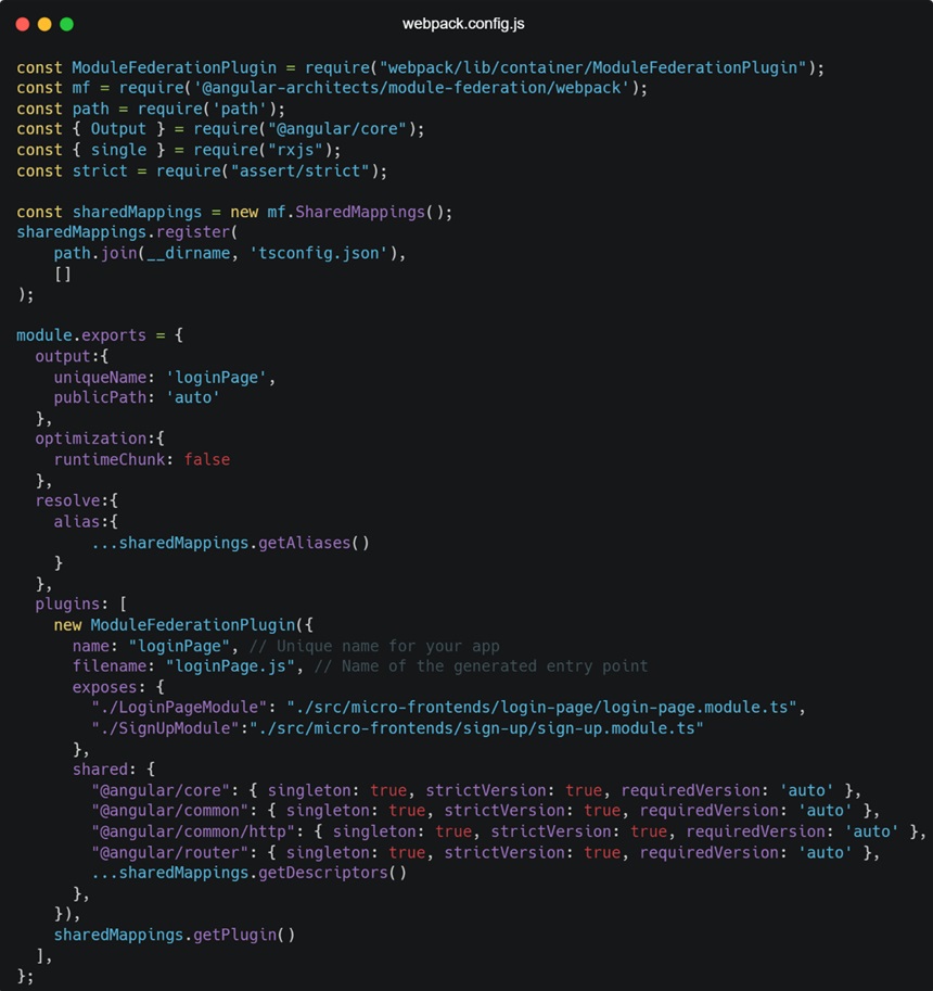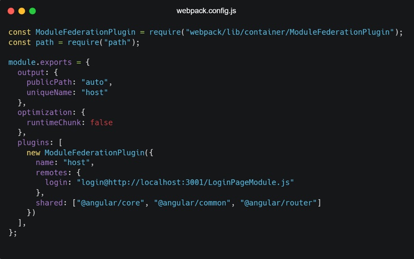 Each micro front-end’s Webpack configuration must specify which modules it exposes and which remote modules it consumes. The ModuleFederationPlugin is used to configure this in Webpack.